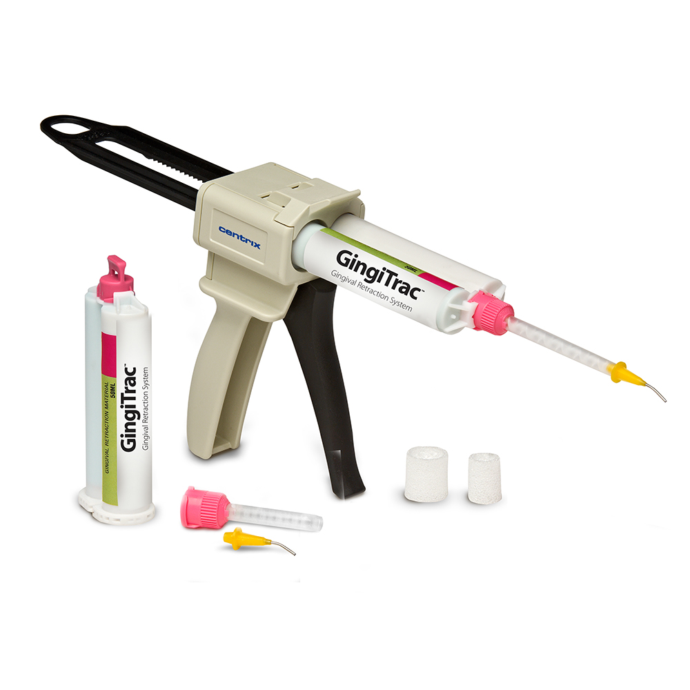 Intraorale tips med buet metalspids til applicering af A-silikoner og GingiTrac i margasin. ( Gul og pink gevind på mixingtips )