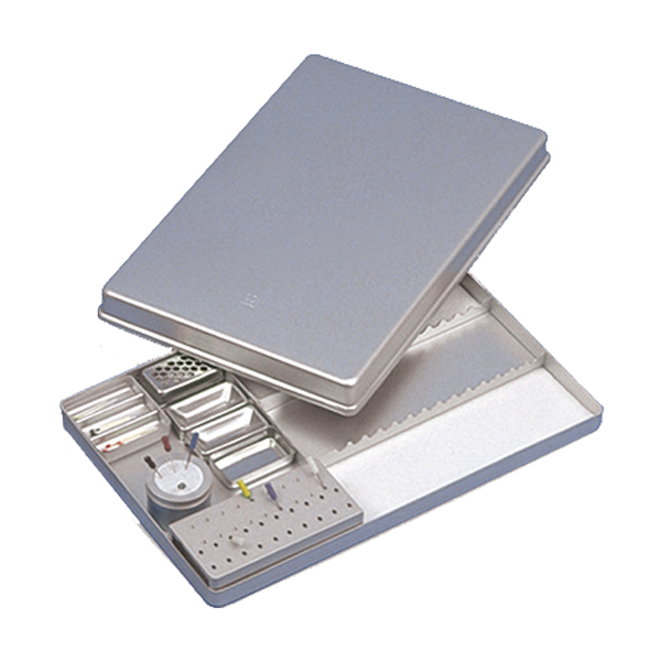 Kasette med låg. Plads til: 14 instrumenter, 38 rodfile, vatpelletæske, 2 medikamentskåle, boræske, 3-delt æske og Clean-Grip. Tåler ikke opvaskemaskine. Ref 416355