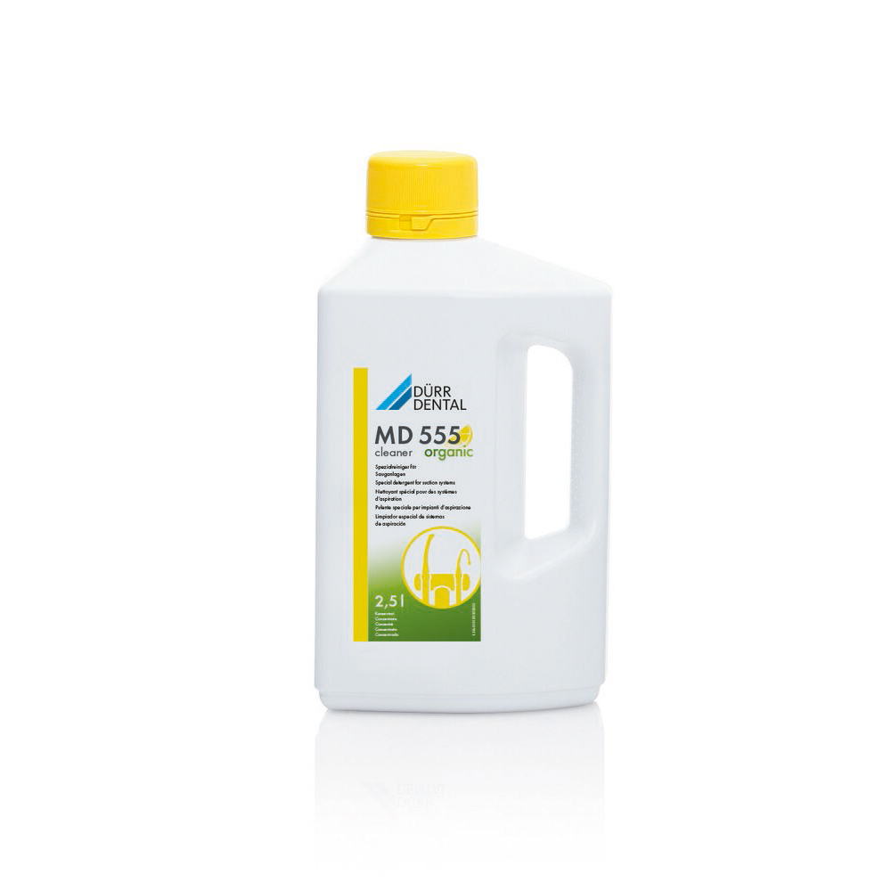 Skumfri specialrengøring til dentale sugeanlæg og afløb. Opløser og forebygger skorpedannelsen fra proteiner, kalk, salte og profylaksepulver. 100% bionedbrydelig Anvendes 1 gang i ugen som supplement til Orotol Plus. Lad ligge i slangerne i ½-2 timer. OBS: MAX 2 timer! Skyl slangerne efter med rent vand. Bruger man jævntligt profylaksepulver, da anbefales det at skylle med MD555 2 gange i ugen. Alternativt for brug 1-2 gange i ugen, kan man også bruge MD555 dagligt i 5min. OBS: For optimal brug bør klinikrummene skylle slangerne igennem på samme tid, for at undgå at produktet bliver fortyndet og derved mister noget af sin effekt.