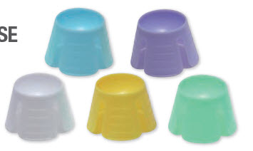 Dappenbægre i plast, med flige til fastsætning på bakkekant. Farver i lavendel-hvid-lysgrøn-lysblå-gul.