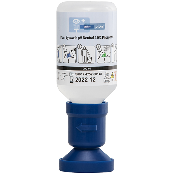 Øjenskylleflaske med 4,9% steril fosfatopløsning og ergonomisk øjenkop, der holder øjet åbent under skylning samt leder væsken væk fra øjet efter skylning. Til ulykker med syrer og baser. Kan kun anvendes én gang da genanvendelse kan give risiko for infektion. Må ikke bruges hvis forseglingen er brudt eller efter holdbarhedsudløb (se etiket). Skylletid ca. 2 minutter