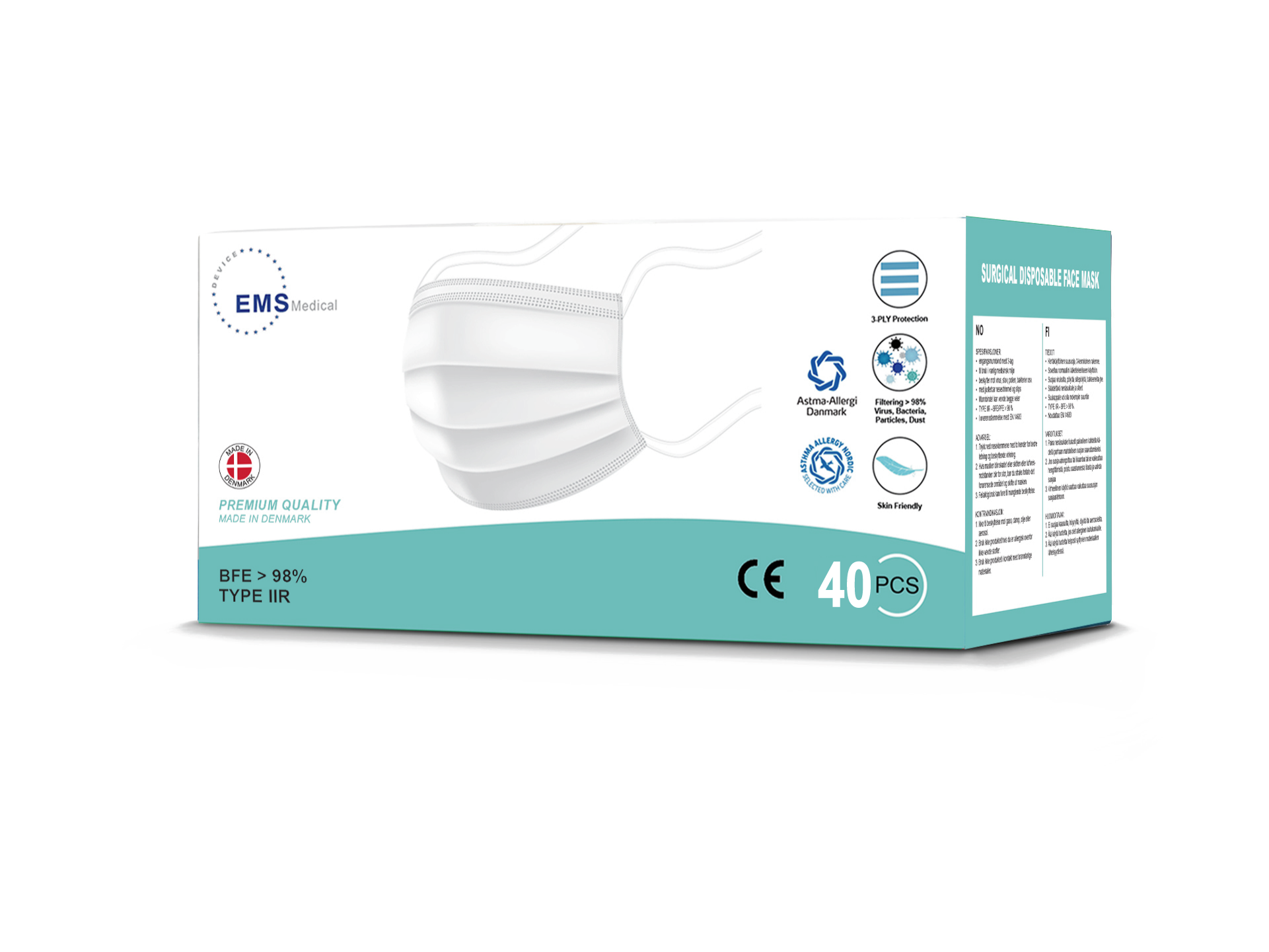 Medicinsk godkendt mundbind. Allergivenlig, latexfri, 3-lags og næseklemme. Bakteriefiltreringsevne (BFE) på over 99%. Opfylder standard EN 14683 og er godkendt og anbefalet af Astma-Allergi Danmark. Luftgenemtrængning 42pa ( Må max være 60pa )
