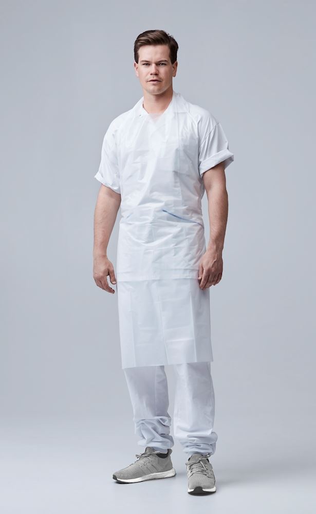 Plastforklæde engangs u/ærmer hvid på rulle