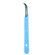 Swann-Mortom skalpelblad på skaft i rustfrit stål med dobbel facetslibning. Blå plastskaft. Lancetformet/buet.