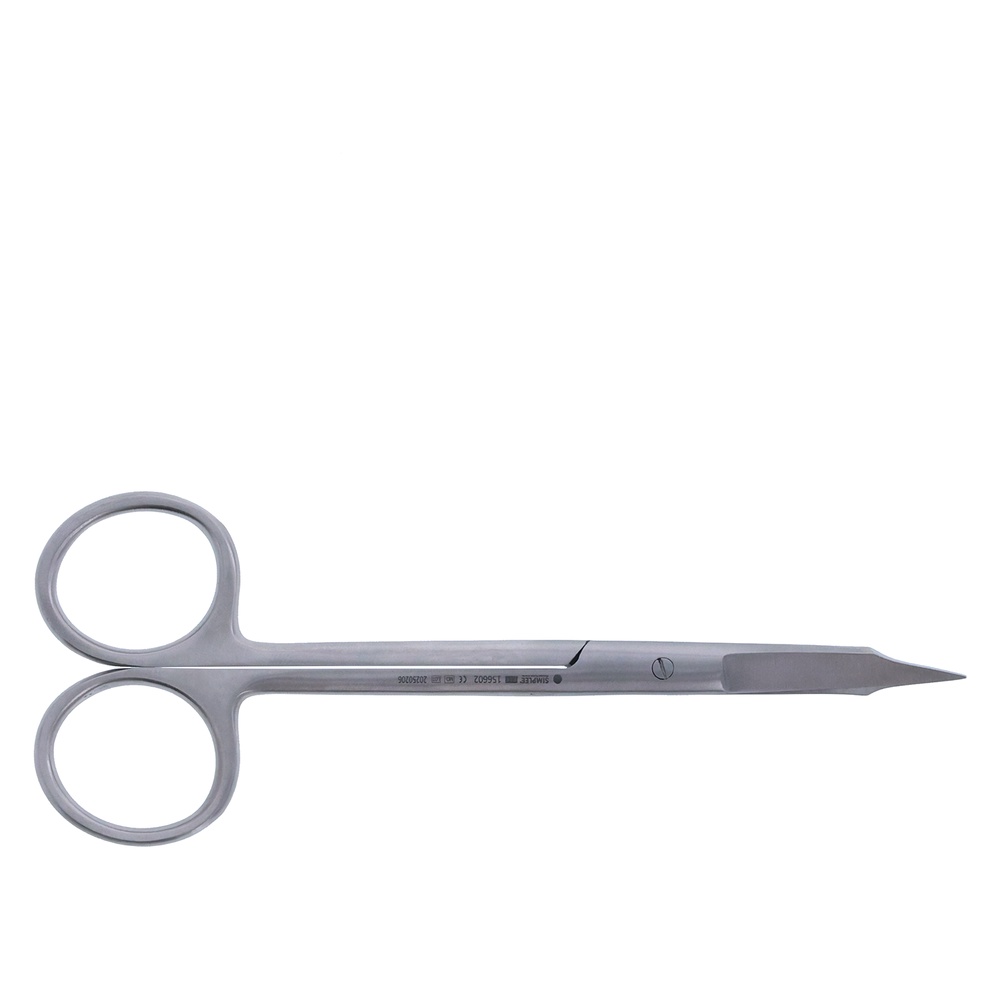 Goldman-Fox buet, gingival saks med korte, skarpe og let buede klinger. Saksen har et langt håndtag og fine spidser som giver god kontrol.