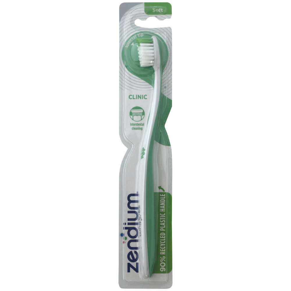 Tandbørste fremstillet i 90% genanvendt plast. Ovalt børstehoved med grøn farveindikator på de yderste børster.